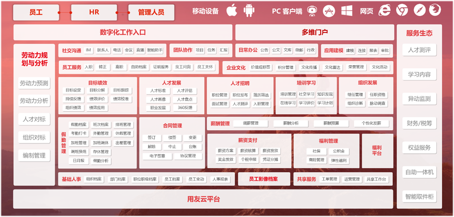 用友人力資本管理融合了先進(jìn)的管理理念和實(shí)踐,為國(guó)內(nèi)外大中型集團(tuán)企業(yè)及各類(lèi)組織提供基于國(guó)際化架構(gòu)下的全生命周期人力資本管理解決方案,包括面向多組織集團(tuán)的人力資源集團(tuán)管控、核心人力資源管理、基于流程的精細(xì)化勞動(dòng)力管理、以持續(xù)績(jī)效、人才發(fā)展、組織發(fā)展為核心的人才管理。