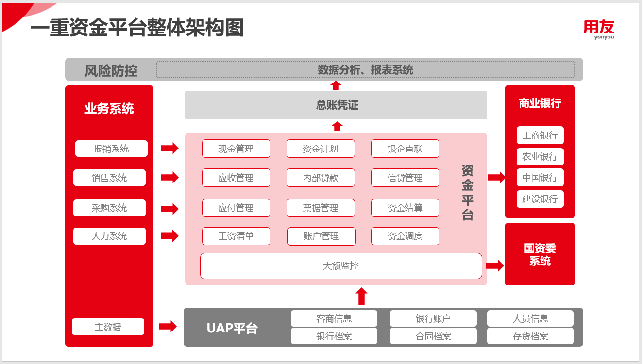 攜手用友打造資金平臺,搭建資金集中監(jiān)控系統(tǒng),實行資金預(yù)算計劃管理,成立資金結(jié)算中心,將資金資源進行集中管控,提升資金使用的安全性、收益性和效率性;打通與采購、銷售、報銷、人力系統(tǒng)的對接,實現(xiàn)數(shù)據(jù)不落地處理;應(yīng)用銀企直聯(lián),實現(xiàn)線上交易結(jié)算;應(yīng)用票據(jù)管理模塊,實現(xiàn)票據(jù)臺賬數(shù)字化;實現(xiàn)與國資委大額監(jiān)控系統(tǒng)的對接上報;實現(xiàn)綜合資金數(shù)據(jù)提取和分析,為資金決策提供支撐。