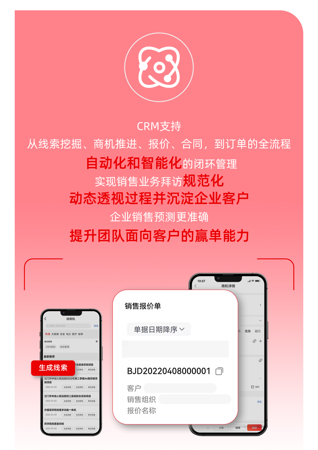 YonSuite全新的客戶關系管理服務支持從線索挖掘、商機推進、報價、合同、訂單的全流程自動化智能化的閉環管理,讓銷售管理變得更為簡單。同時,還能動態透視過程并沉淀企業客戶,企業銷售預測更準確,從此贏單不再難。