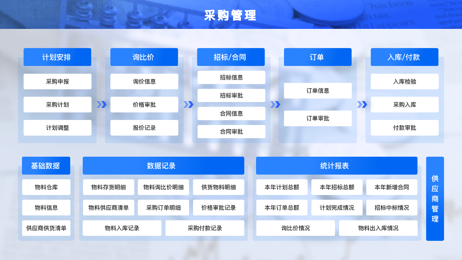 以單位、企業(yè)生產(chǎn)經(jīng)營的采購需求為原點,管理供應(yīng)商與采購的相關(guān)信息。按照采購、執(zhí)行、監(jiān)管分立的原則,依靠科學(xué)化、合理化的采購制度和監(jiān)管制度,有效避免采購過程中的暗箱操作。通過信息化手段規(guī)范采購流程,完善合法、合規(guī)的招標與合同業(yè)務(wù)流程,加強審批流程控制和數(shù)據(jù)統(tǒng)計分析,強化對采購業(yè)務(wù)的管控與監(jiān)督。