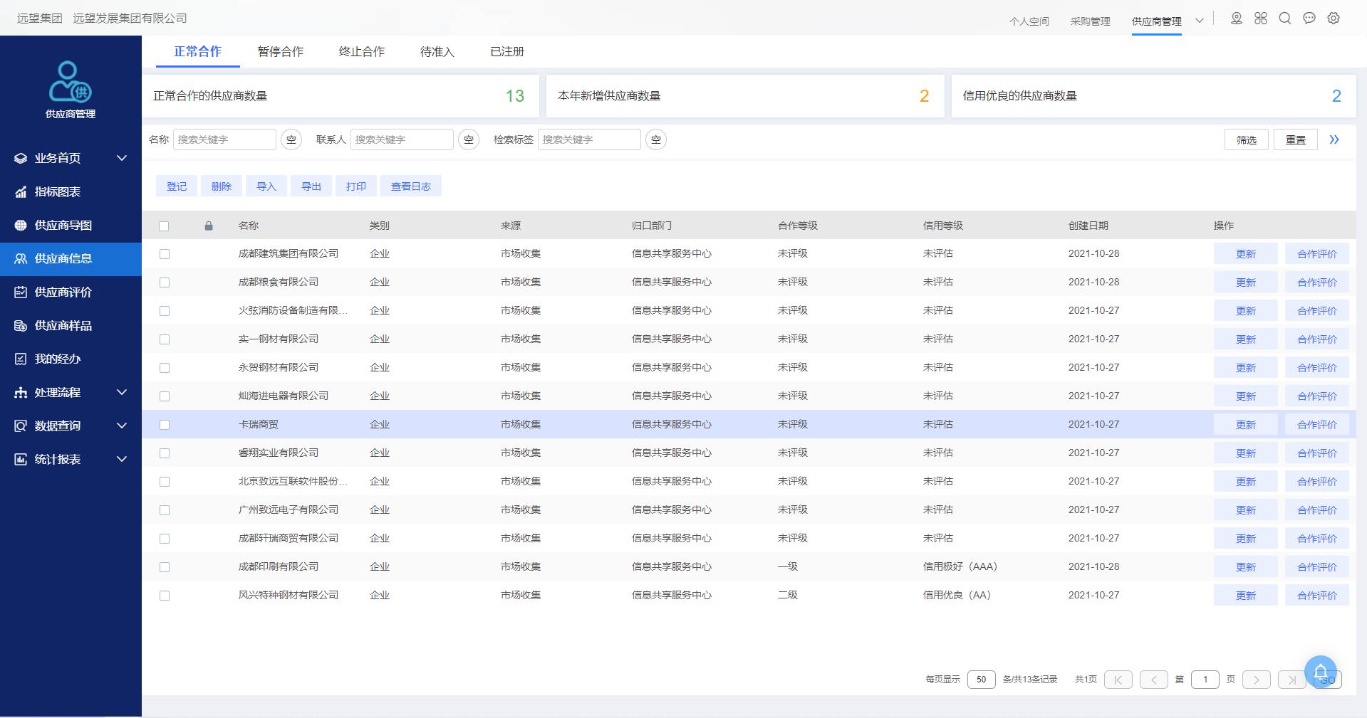 將供應(yīng)商的信息檔案作為供應(yīng)商管理的核心,從供應(yīng)商注冊、考察評價、準入審批、樣品管理到合作評價、等級評定、信用平臺、問題整改直至供應(yīng)商的退出或停止合作,全過程均納入管理,從而提升單位、企業(yè)對供應(yīng)商信息的全方面掌握,強化對供應(yīng)商的管控。