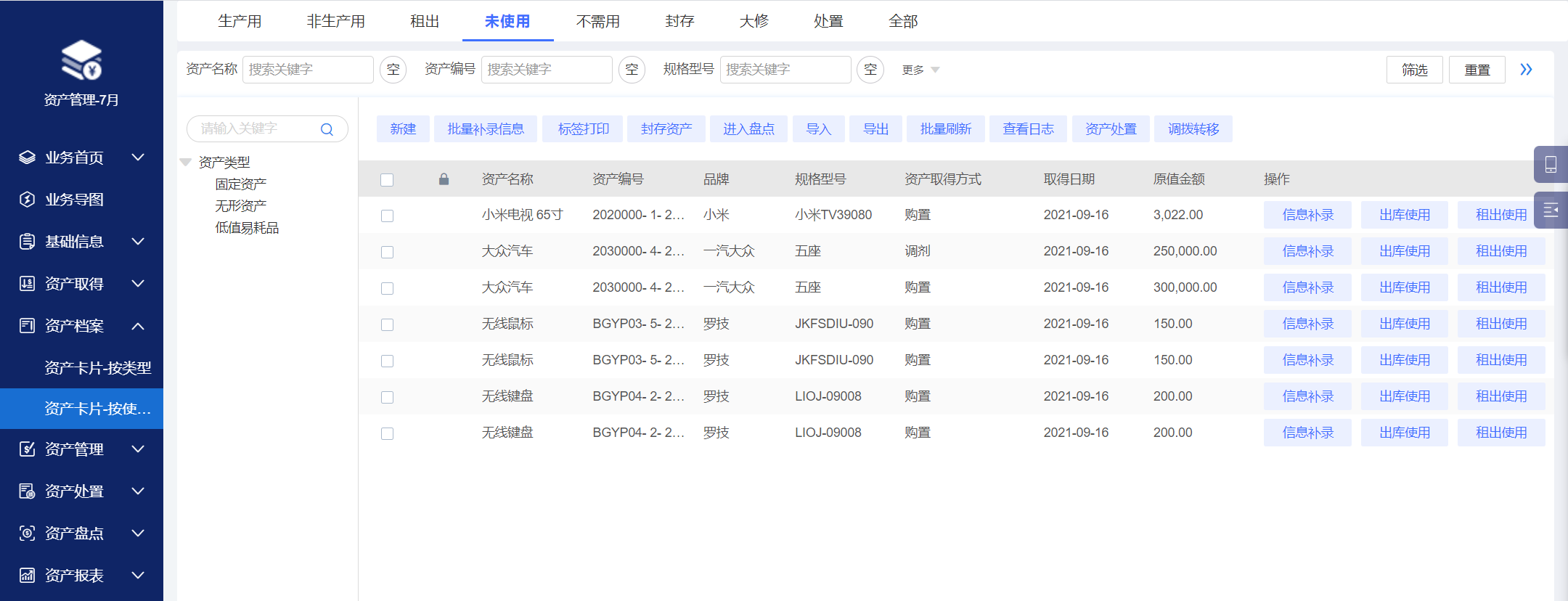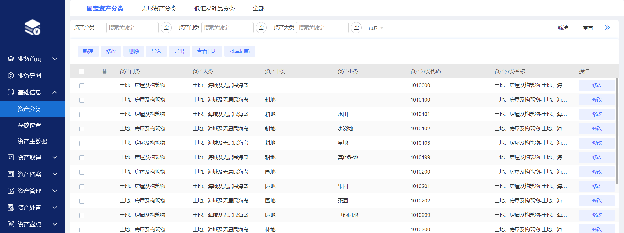 包含了對固定資產、無形資產、低值易耗品全量資產,覆蓋資產分類、存放位置、主數據等基礎信息管理,以及從資產采購、入庫、領用、調撥、移交、歸還、盤點、處置等全生命周期流轉管理。
