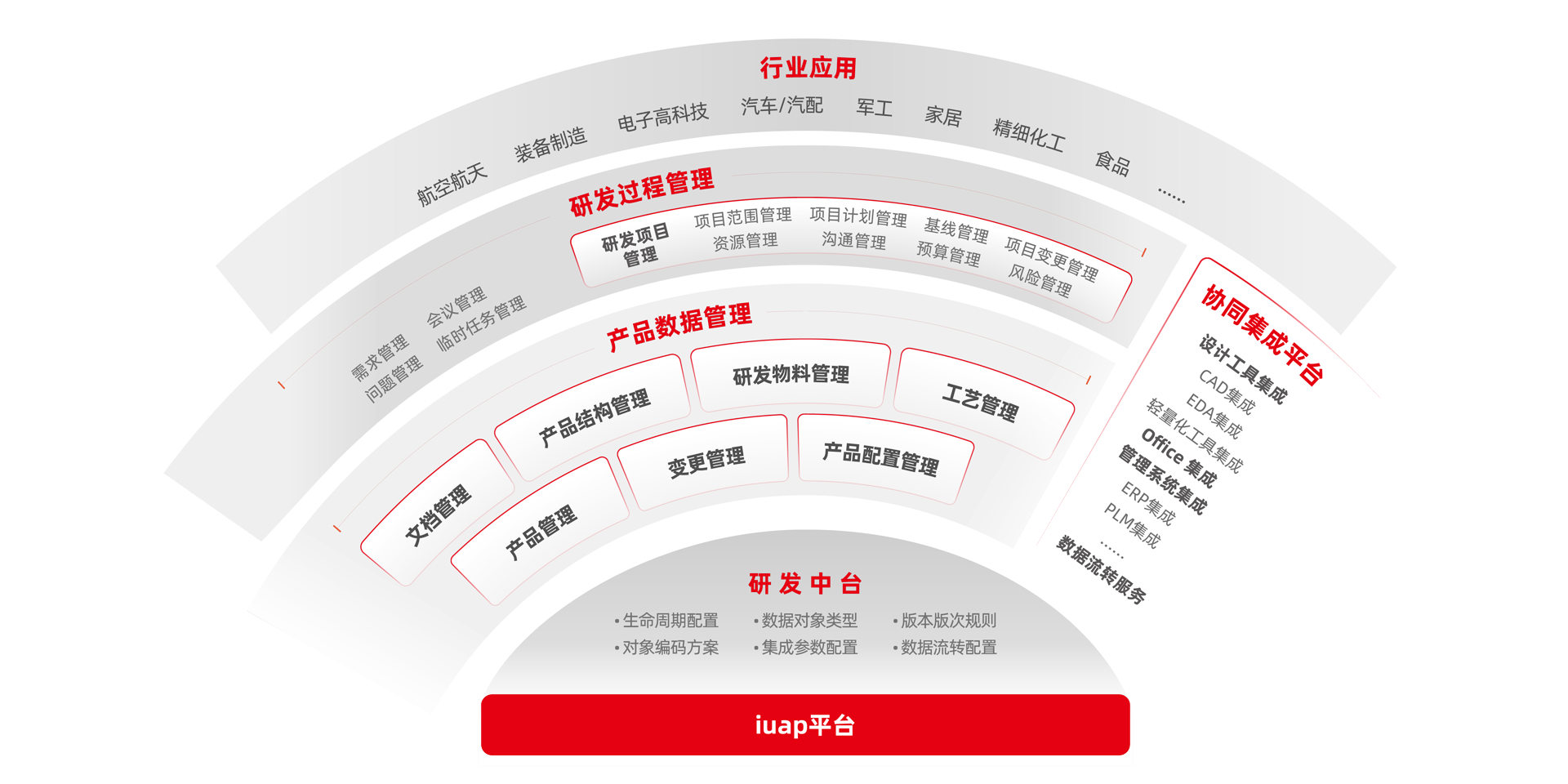 包括研發工具整合平臺、系統整合平臺、業務整合平臺,銜接從市場、需求、研發、設計、工藝、施工、售后再到維的修全過程,達到真正意義上的產品全生命周期過程管控。